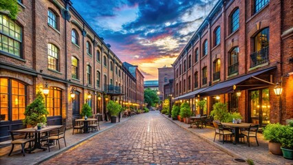 Historic industrial area transformed into trendy entertainment hub, featuring brick buildings, cobblestone streets, and converted warehouses now housing bars, restaurants, and boutiques.