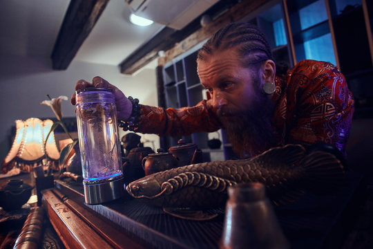 Tea master in kimono making natural tea in the dark room with a wooden interior, watching on tea leaves during brewing