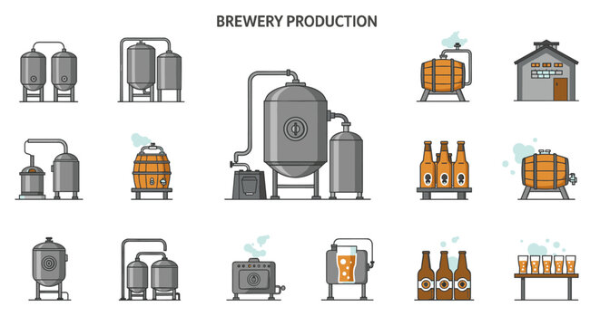 Beer set with tap, class, can, bottle and tanks from brewery factory.