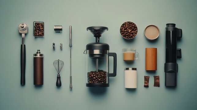 A detailed illustration showcasing various coffee brewing equipment and tools used