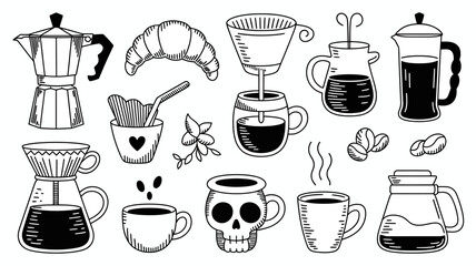 Coffee and Croissant Illustrations, Various Brewing Methods and Cups
