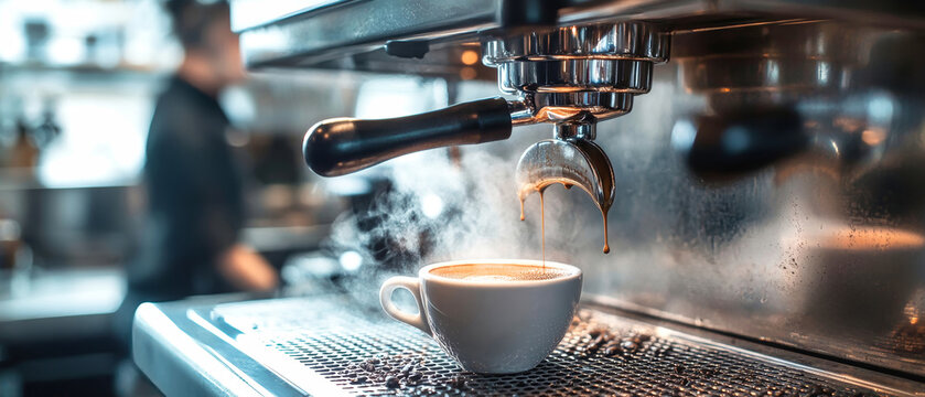 Capturing the magic of brewing espresso with steam dancing in the air at a bustling cafe