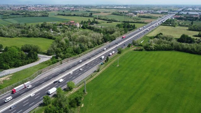 Aerial view of A4 freeway in Cavenago di Brianza, Po Valley near Milan, Lombardy, Italy. Italian landscape with industrial buildings, towns and highway traffic seen from drone flying in the sky