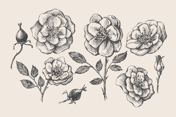 Set of hand-drawn rose hip flowers. Buds, leaves, fruits of garden flowers vector illustration. Botanical image for floral background. Design element for greeting card, poster, cover, invitation.