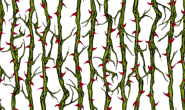 Hand drawn vector seamless pattern of vertical briar patch with stems and thorns.