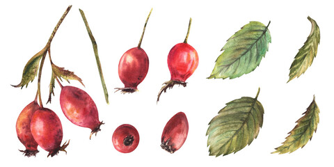 Watercolor dog-rose with berries and green leaves, isolated on white background. Hand drawn botanical briar set.