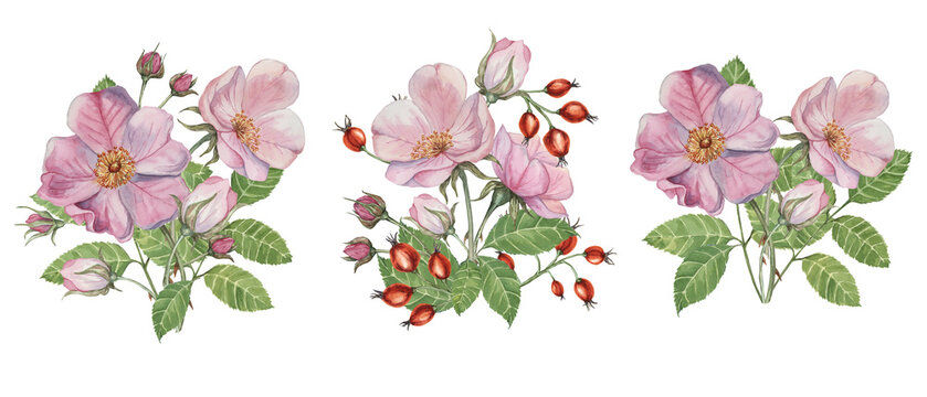 Dog rose bouquet, rosa canina watercolor floral boutonniere. Pink flower bundle, rose hip, buds and leaf of wild rose. Botanical printable briar clipart for packaging, beauty, cosmetics, perfume, food