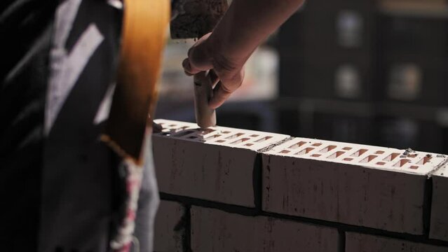 Construction, Heavy Labor Works Concept. Worker In Protective Uniform And Helmet Building Brick Wall With Trowel In Hands. Construction Worker At Work. Cartoon Linear Outline Flat Vector Illustration