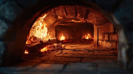 A large brick oven emitting glowing embers, creating a warm and inviting atmosphere