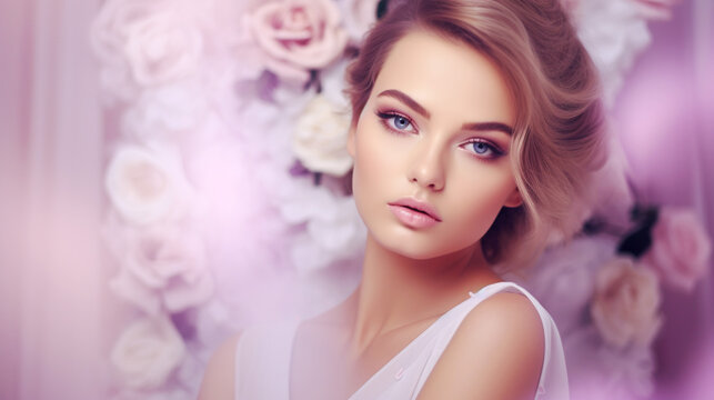 Portrait of beautiful girl in an elegant wedding dress on purple pink background with flowers. Close-up, copy space. Banner