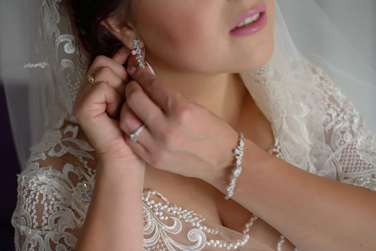 Beautiful bride in white lace wedding dress and embroidered veil wearing vintage diamond jewelry and adjusting earring clasp, getting ready for the wedding day or bridal accessories promoting concept