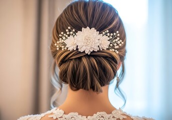Intimate shot of a romantic bridal updo chignon, highlighting fine lace wedding dress detail and elegant pearl floral hair accessory, high-end photography for beauty and wedding marketing