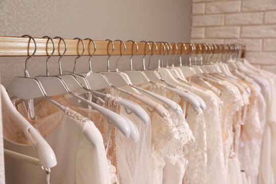 Elegant wedding dresses hanging on hangers in shop. Bridal dress in wedding boutique salon