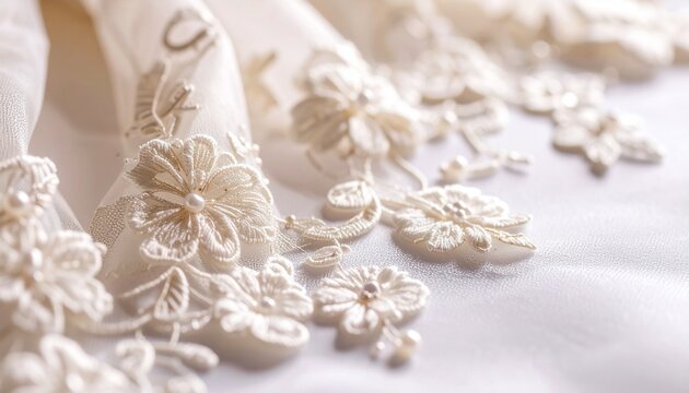 Closeup of intricate white lace fabric with floral embroidery and beads