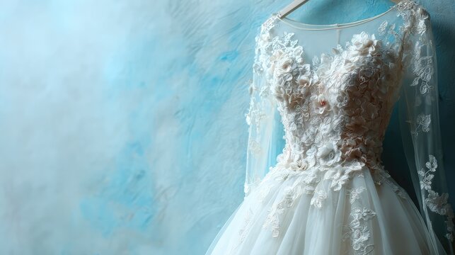 Delicate Wedding Dress Adorned with Intricate Floral Embroidery Hanging on a Hanger Against a Soft Blue Background for Bridal Fashion Photography