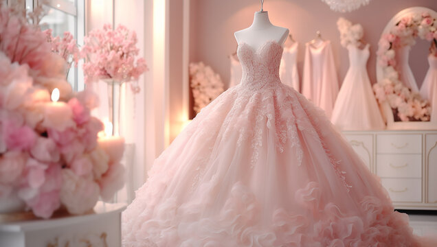 Closeup pink wedding dress in bridal salon room background. Banner. Front view of stylish dress for wedding day. Beautiful clothes for bride. Copy Space. Ai generative