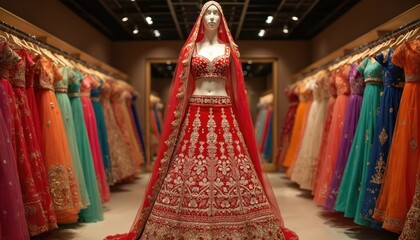 Mannequin wears red bridal lehenga with gold embroidery. Colorful Indian wedding dresses displayed in luxury boutique. Traditional attire for women fashion.