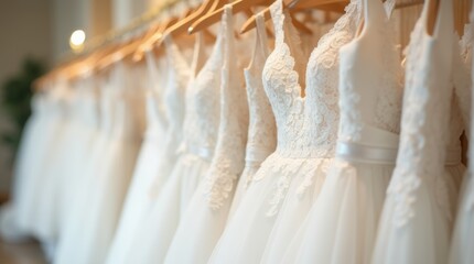 White wedding dresses displayed in a boutique with lace and satin details. Bright lighting highlights the luxurious and romantic atmosphere of the setting.