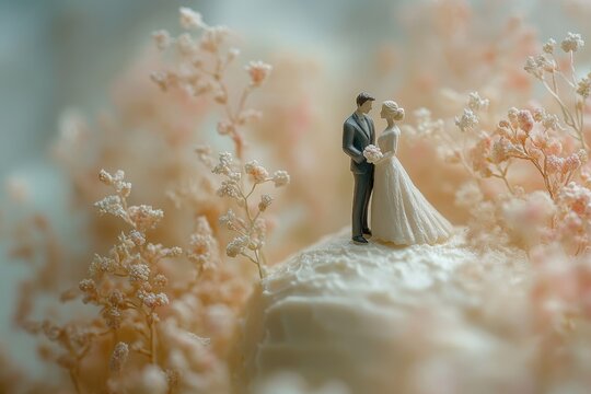 Miniature bride and groom figurines embrace on a creamy textured surface adorned with delicate, pastel flowers.