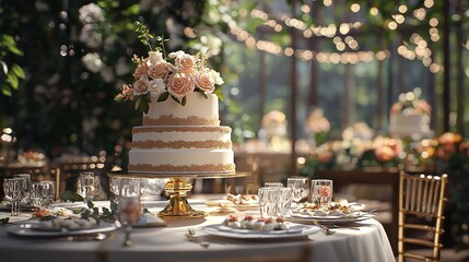 Vintage wedding cake adorned with birds in rustic garden, celebration