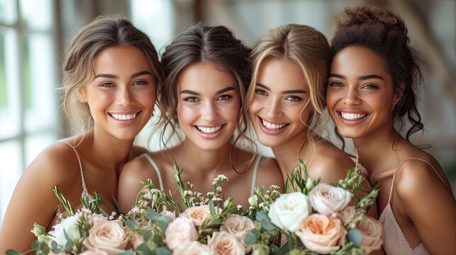 four women taking selfie, cheerful bride and her interracial bridesmaids,  happiness, champagne glasses, bridal bouquet, wedding dress, bridesmaid gown, brunette and blonde women