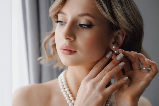 Portrait of happy elegant young woman with white earrings in modern bridal look with classic hairstyle and makeup with pearl necklace