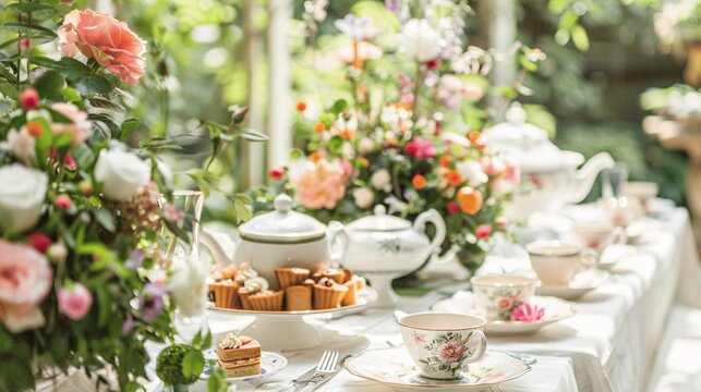 Table set for elegant garden tea party with roses, pastries, vintage tea ware. Refreshments served outdoors in green foliage. Afternoon gathering with sweet treats, floral decor. Serene nature