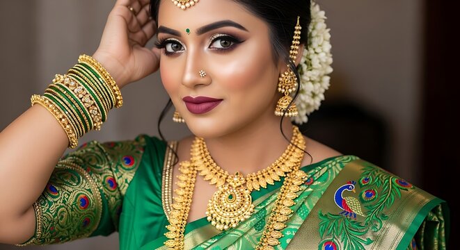 Indian bridal makeup and jewelry green saree traditional wedding look