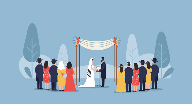 Jewish wedding ceremony illustration with diverse adult guests in nature setting. Vector illustration
