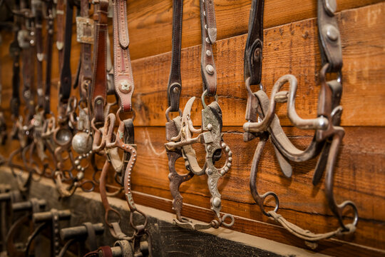 Western style horse tack, brown cowboy saddle with curb bit bridle and girth