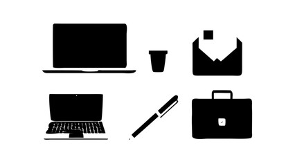 Vector art of essential work tools laptop, cup, envelope, pen, and briefcase are depicted as black vector icons, representing modern office essentials in a minimalist style