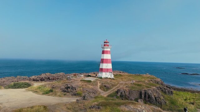 Cinematic drone shot Nova Scotia Brier Island Lighthouse Towers Above The Rugged Shoreline, Offering A Perfect Example Of East Coast Canadian Maritime Architecture And History.