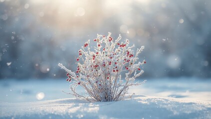 Snow-laden dog roses and icy forest backdrop creating a winter landscape, highlighting seasonal transition