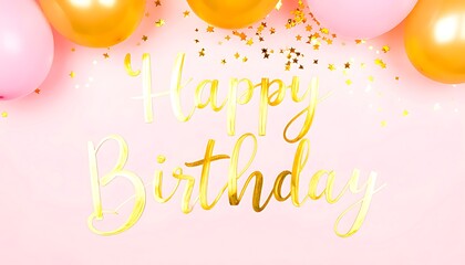 Gold Happy Birthday Banner Against a Pink Background with Balloons and Confetti.