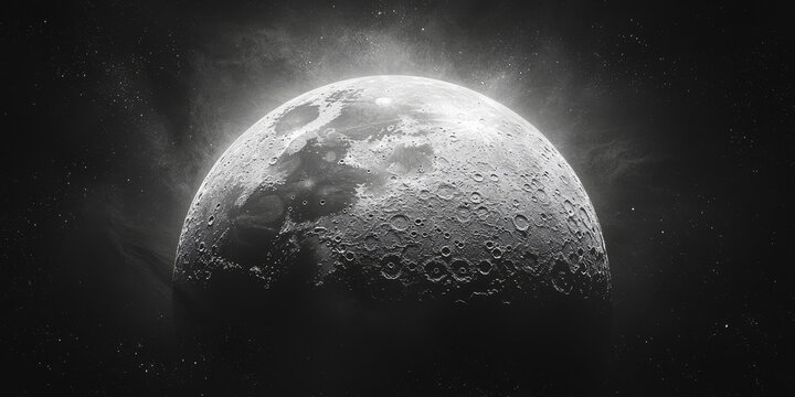 A black and white photo of the moon in space.