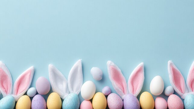 Top view of easter party setup with pastel blue, pink, yellow, and white eggs and bunny ears on light blue background with central copy space for festive spring celebration