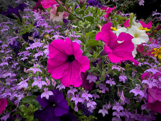 Panorama of colorful summer flowers. Flower bed of phlox and marigold flowers. Panorama of bright summer flowers in urban conditions.