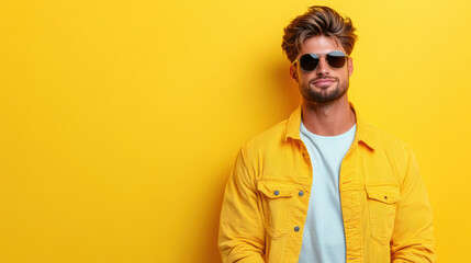 Stylish man in sunglasses wearing yellow jacket against bright background
