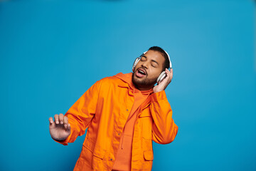 Young man in vibrant orange outfit enjoying music in a studio with a blue backdrop