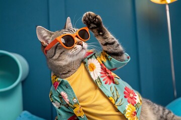 A vivacious woman in a red outfit and oversized red sunglasses, her expression full of surprise and delight, against a bright blue background that pops with energy