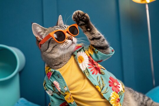 A cheerful dog wearing a vibrant, colorful outfit and floral crown poses happily against a bright yellow background, showcasing a joyful expression that captures the essence of a fun celebration.