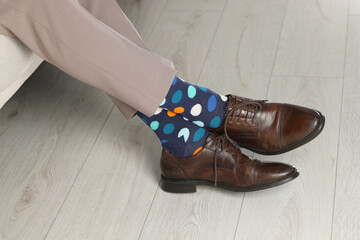Man wearing stylish shoes and colorful socks indoors, closeup