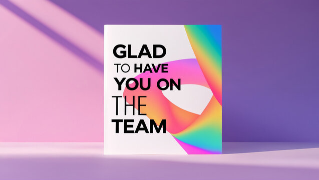 A greeting card design with a minimal composition, bold yet clean typography showing ‘Glad to have you on the team’, bright vibrant gradient backdrop.