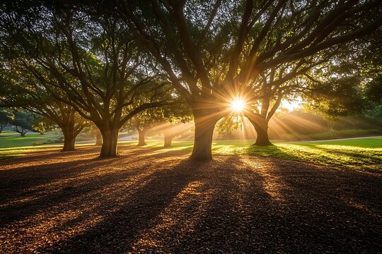 The Warm Glow of Early Morning Sunlight Streaming Through Trees