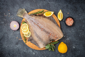 Raw flounder fish flatfish with lemon and spices on a dark background. banner, menu, recipe place for text, top view