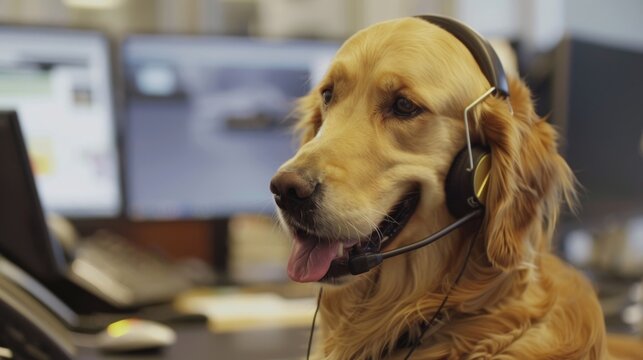 Golden retriever with a headset on in a professional setting. Dog acting as a customer support agent. Pet in the workplace bringing joy and assistance.