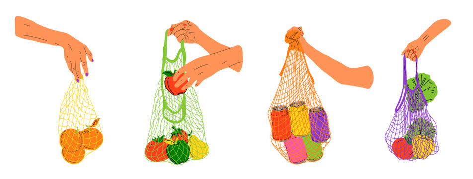 Set of Hand hold eco bag. People bring own bag for grocery. Reusable plastic free pack with food. Zero waste products for shopping. Eco bag shopper, organic green ecological illustration