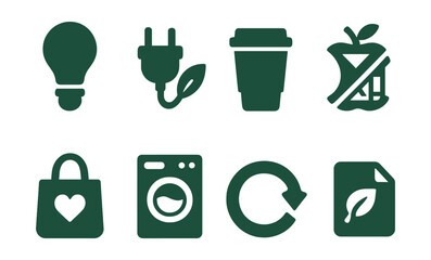 Solid style icons of green habits: turn off light, unplug device icon, bring your own cup, food waste cut, thrift shopping bag, minimal laundry icon, second-hand badge, paperless option.