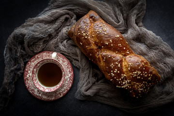 Close up of brioche bread with cup of coffee