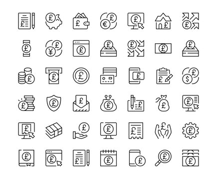 British pound icons. Outline symbols collection. Premium vector line icons set